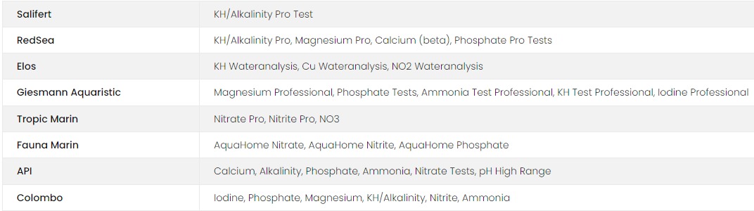 Der ReefBot Lab ist das neueste Modell mit einem verbesserten Design und fortschrittlichen Funktionen, einschließlich 12 Ampullen für mehr Testmöglichkeiten. Dieses Gerät misst die Werte der gängigsten Aquarienparameter, einschließlich Alkalinität (KH), Kalzium (CA), Magnesium (Mg), Nitrat (NO3), Nitrit (NO2), Phosphat (PO4), Ammoniak (NH3), Kupfer (Cu), Jod (I2), Eisen (Fe), pH-Wert (hoch, niedrig und weiter Bereich), Kalium (K), Siliziumdioxid (Silikat), Sauerstoff (O2), Kohlendioxid (CO2), Chlor (Cl), Brom und allgemeine Härte (GH).